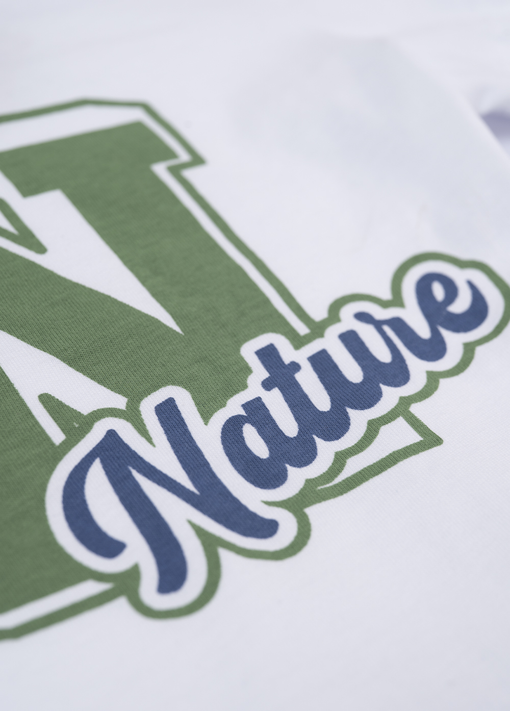Un básico renovado para el armario de tu pequeño. Esta camiseta blanca de manga corta es versátil y fácil de combinar. Su estampado frontal con la inicial ‘N’ y la palabra ‘Nature’ le da un aire casual y a la vez significativo. Con botones en el hombro para facilitar el vestir, es ideal para cualquier aventura.