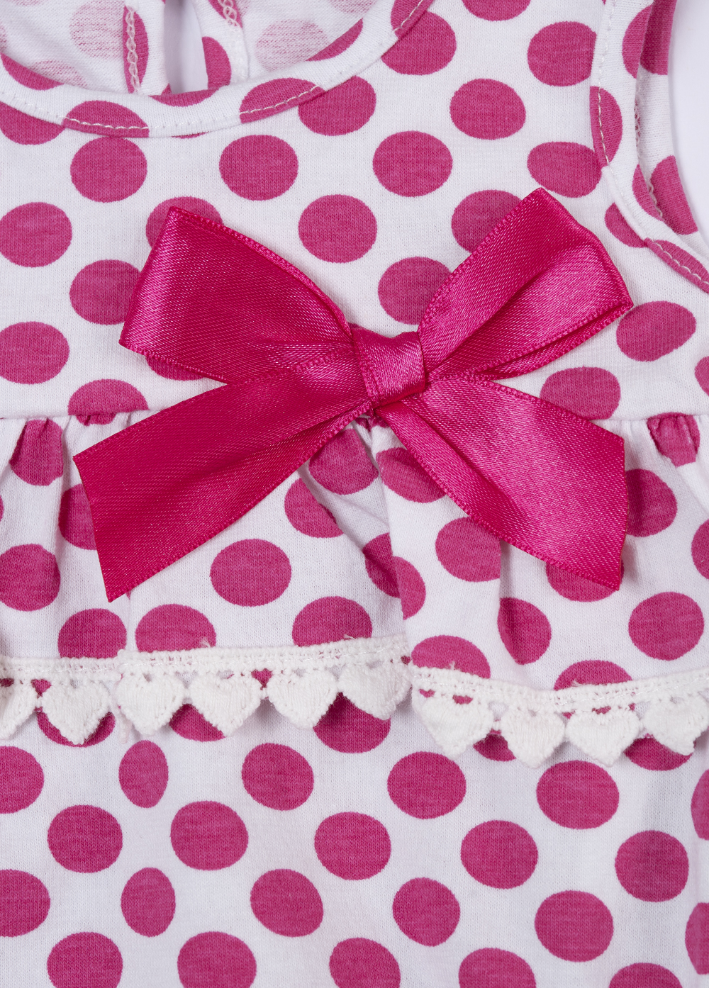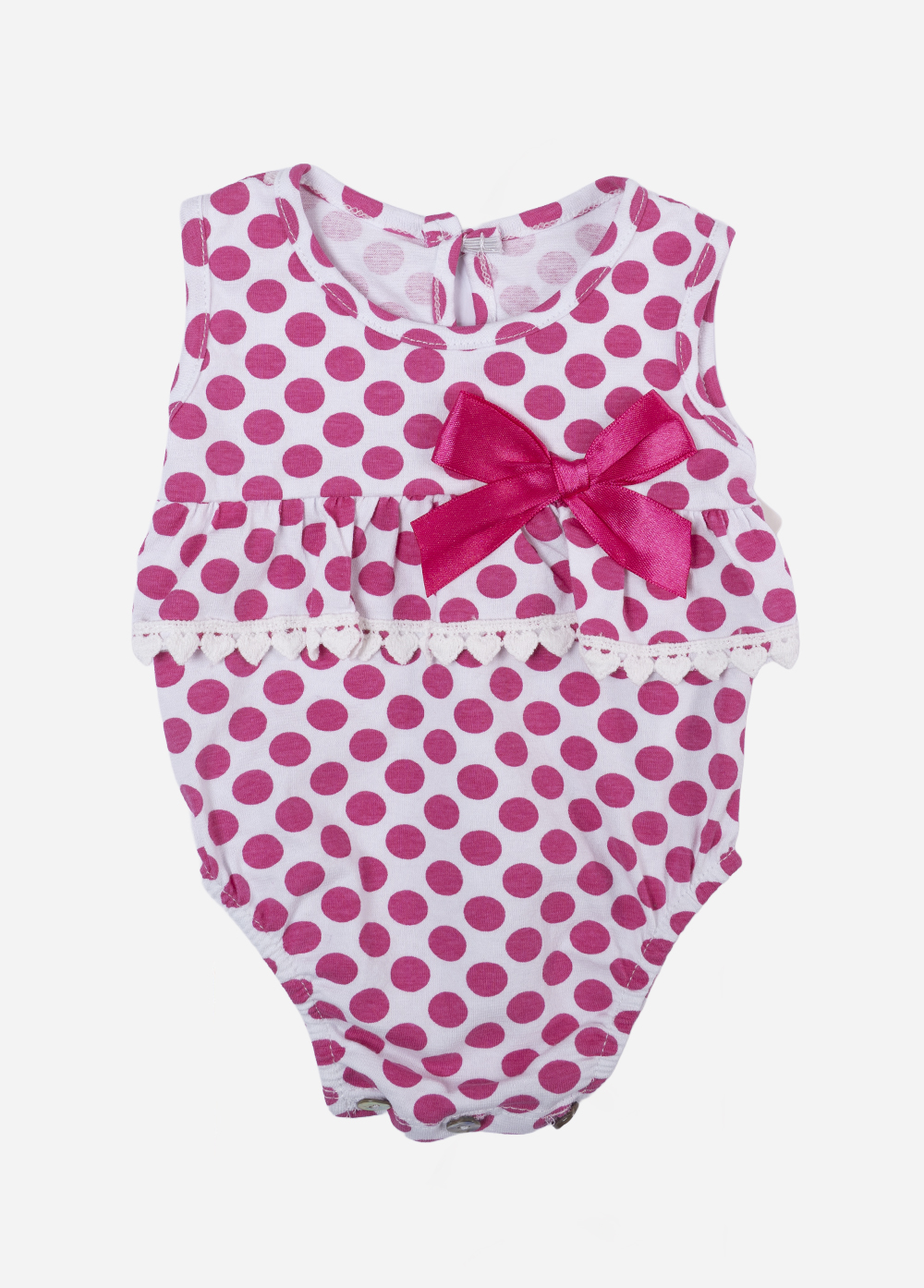 Este adorable pelele sin mangas es perfecto para lucir en ocasiones especiales o en salidas de verano. Con un alegre estampado de lunares fucsia sobre fondo blanco, se complementa con un coqueto lazo al tono en el pecho y un delicado detalle de encaje. Su diseño cómodo y práctico permite libertad de movimiento para tu bebe, mientras que el cierre trasero y entrepierna facilitan el cambio de ropa.