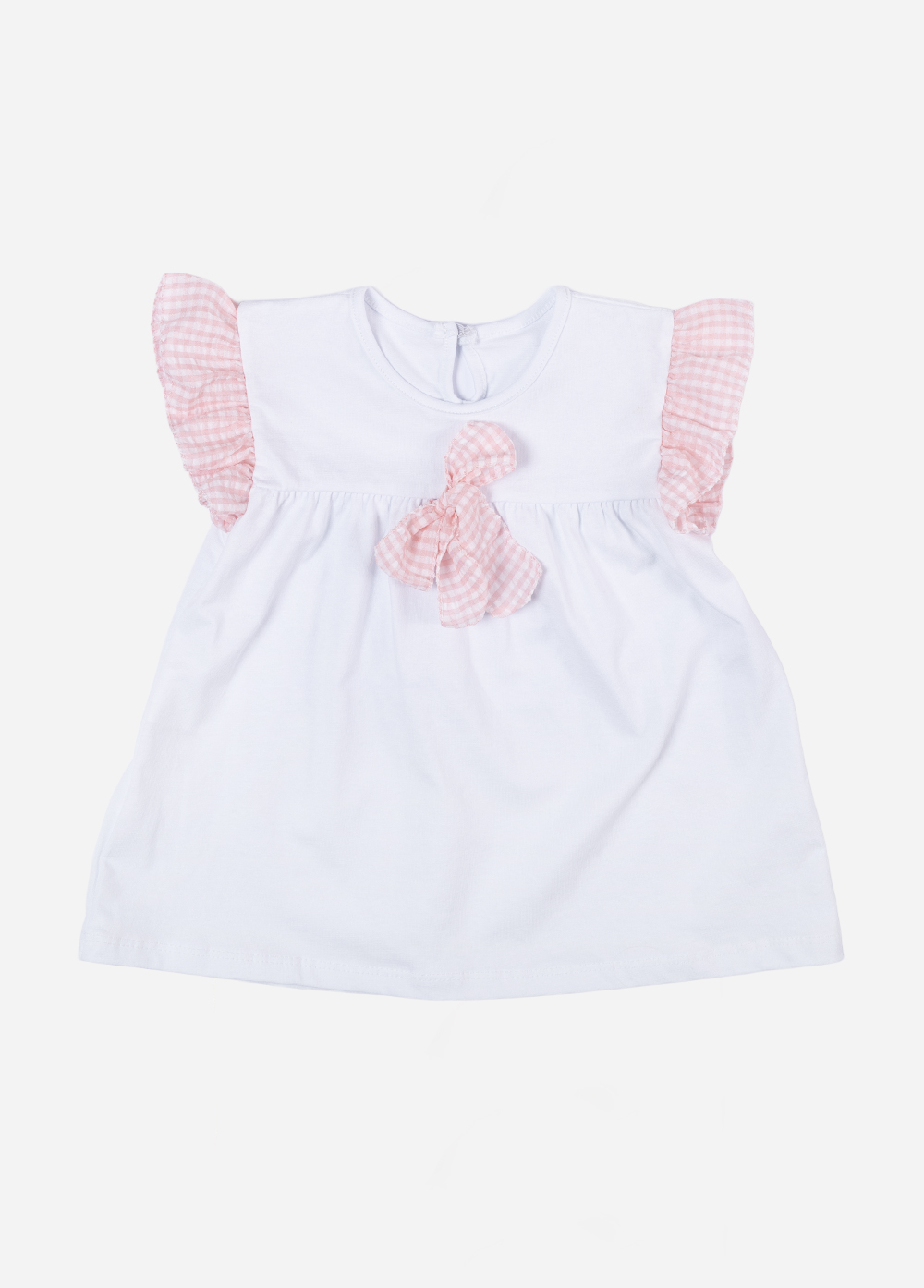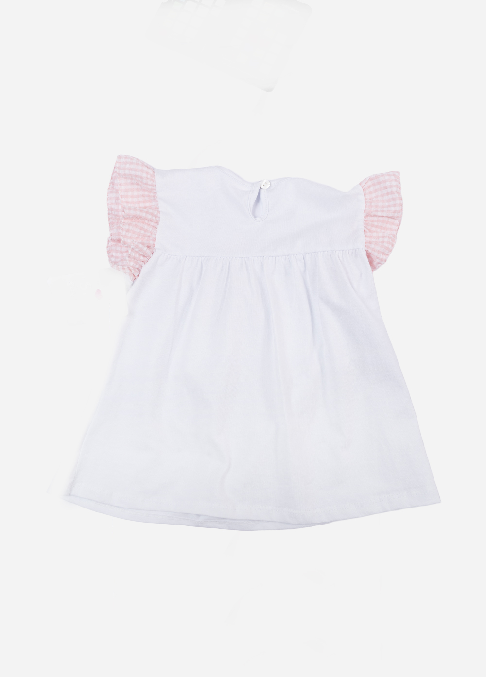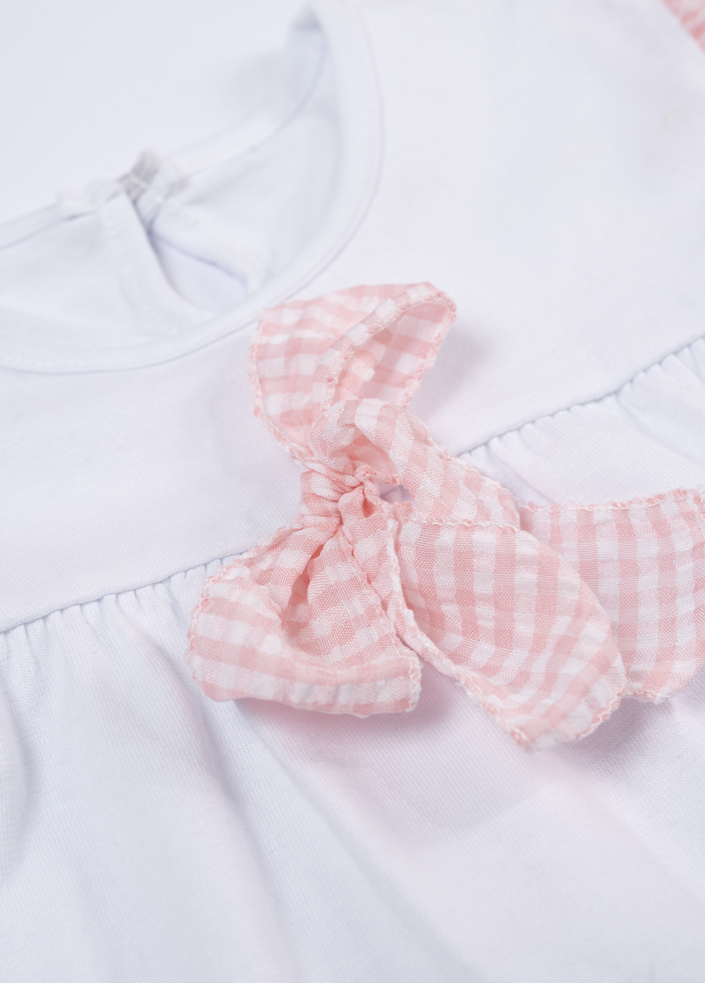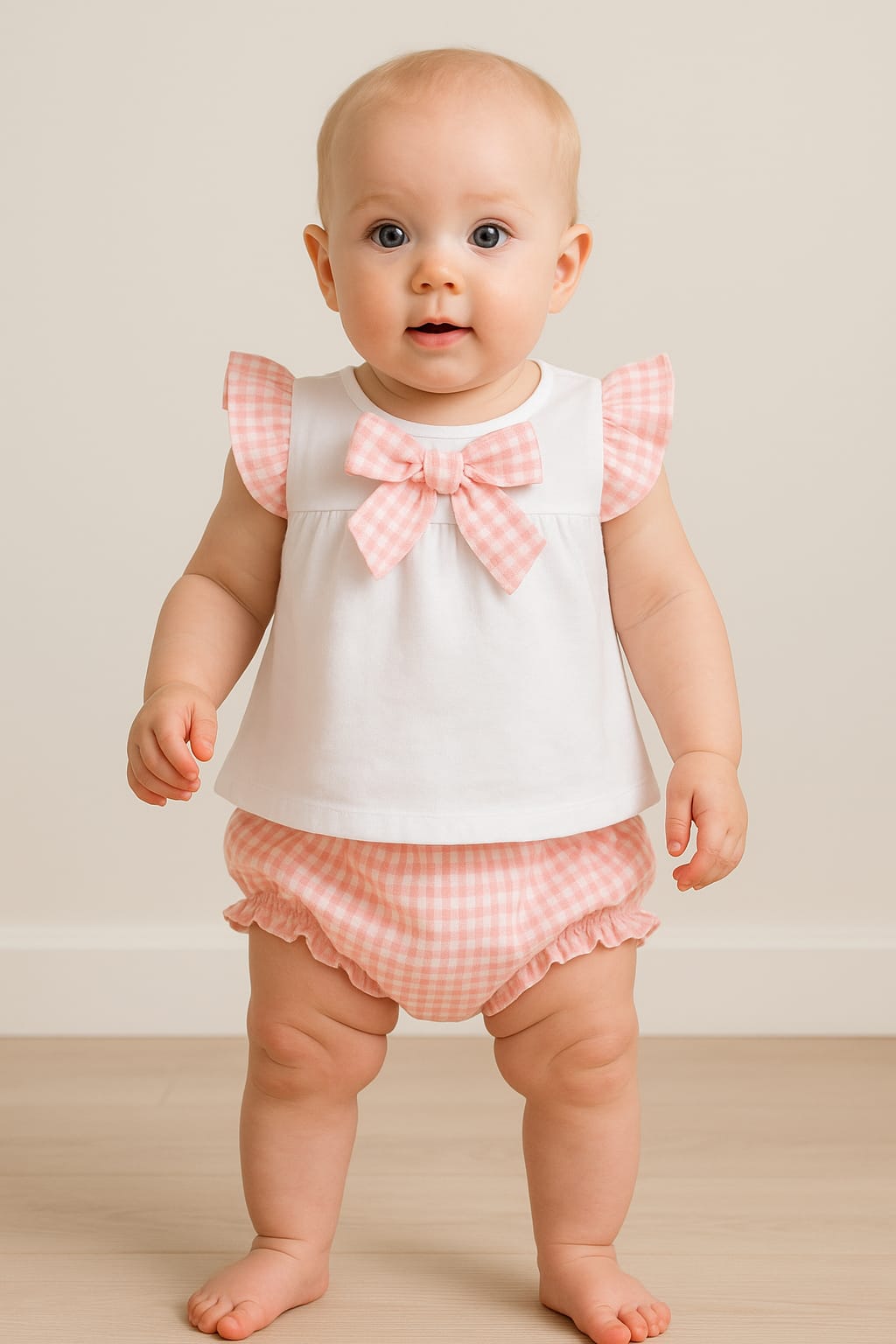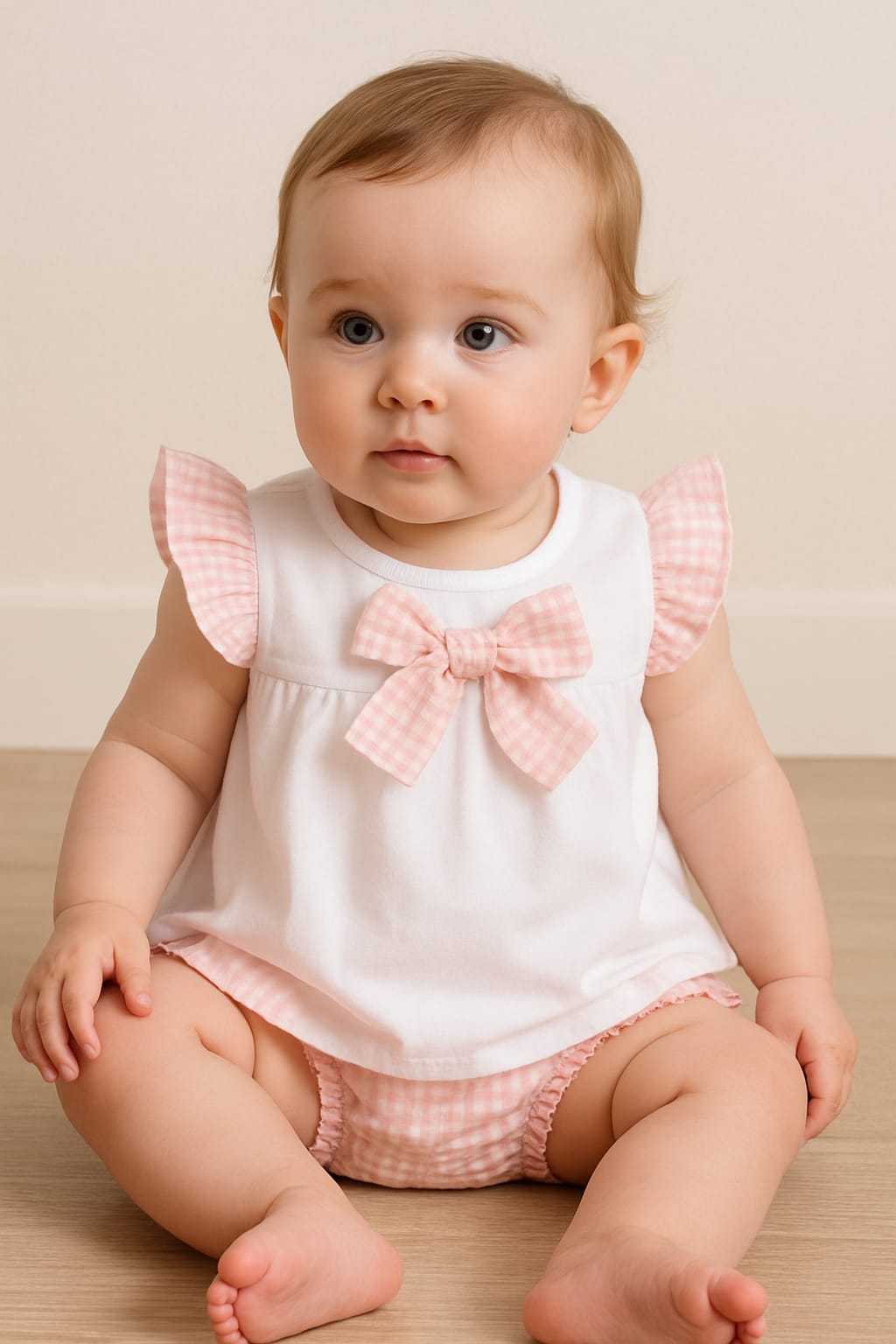Este delicado conjunto ha sido diseñado para ofrecer un equilibrio perfecto entre elegancia, suavidad y funcionalidad. La blusa blanca, confeccionada en algodón 100% de alta calidad, presenta un corte amplio y ligero, con mangas de volante y un lazo central en tejido Vichy rosa que aporta un aire clásico y encantador.