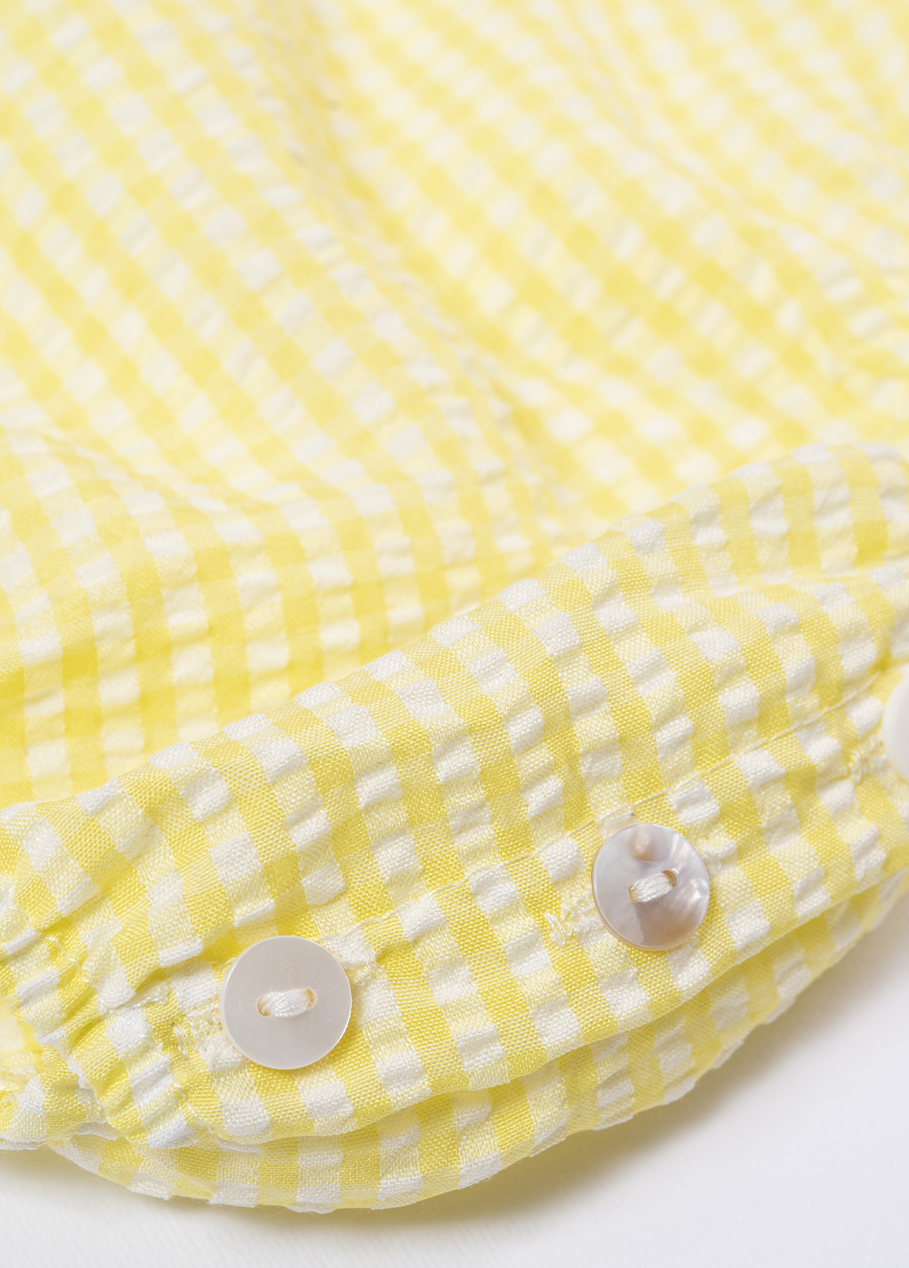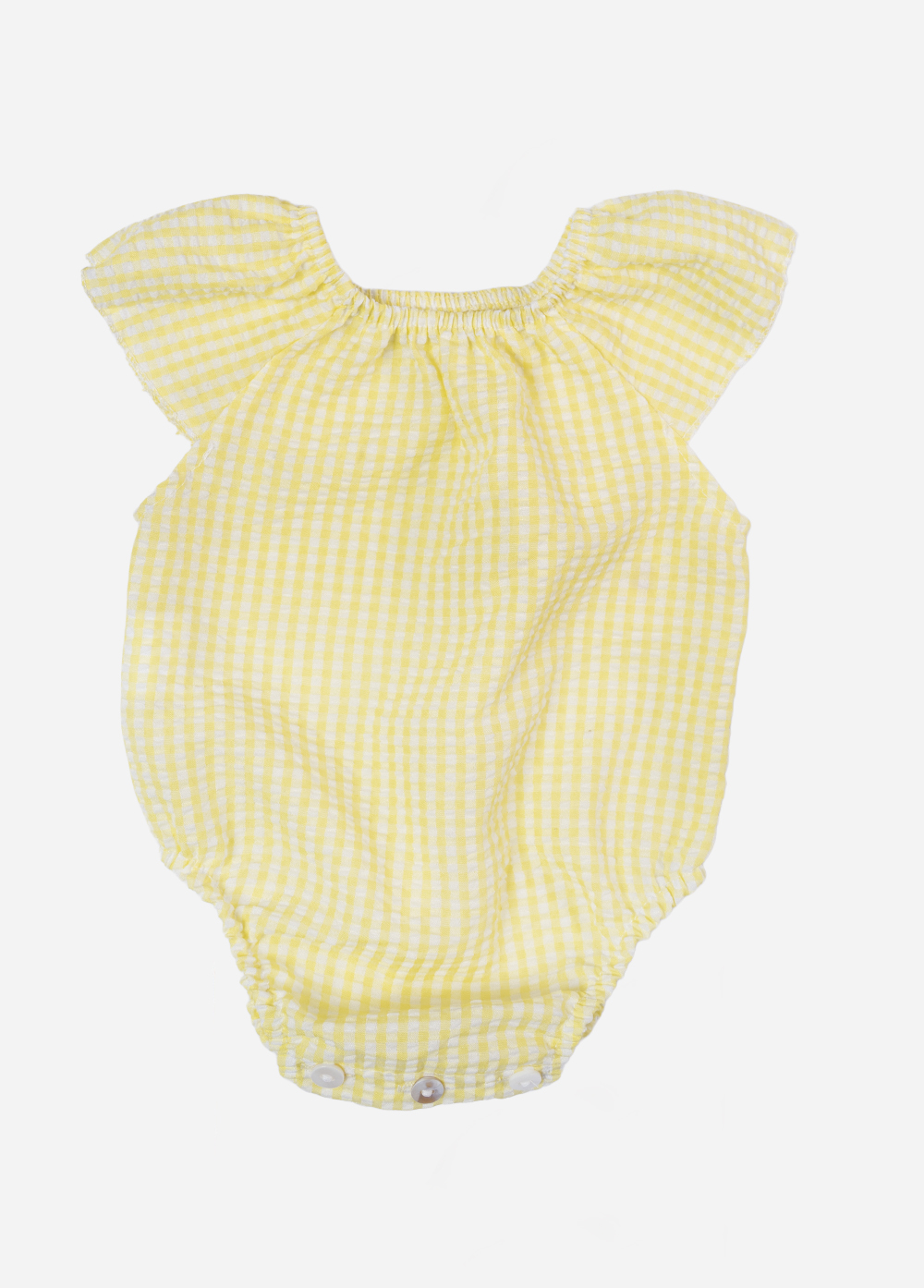 Este adorable pelele para bebe combina estilo y practicidad en una sola prenda. Con un alegre estampado de cuadros Vichy en amarillo y blanco, su diseño fresco es perfecto para los días cálidos. Confeccionado en un tejido ligero y transpirable, cuenta con mangas cortas con fruncido elástico que aportan un toque dulce y elegante. La parte inferior también incluye elástico para un mejor ajuste y comodidad durante todo el día.