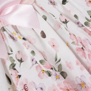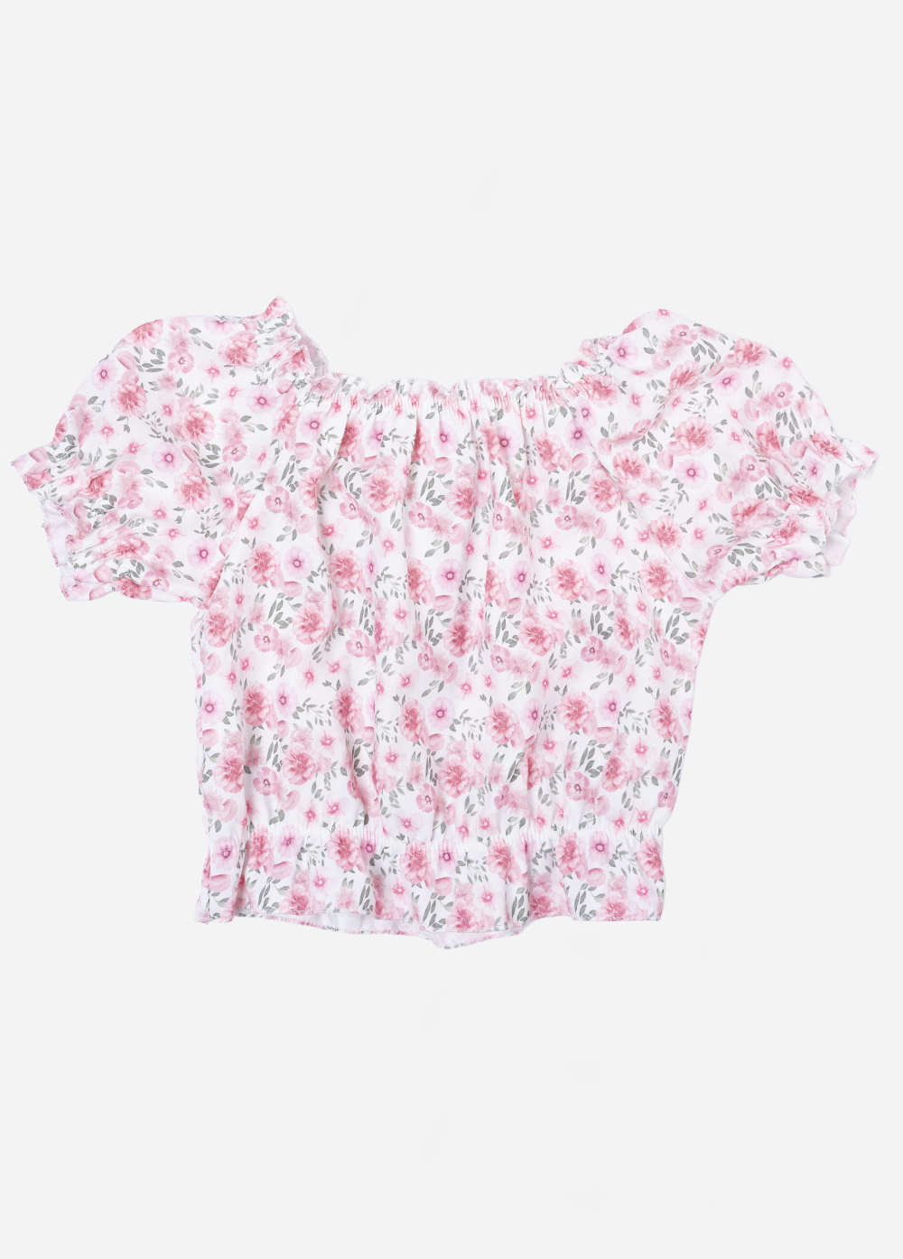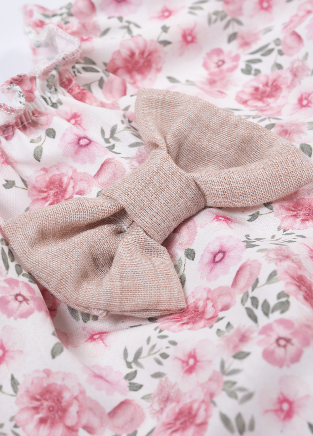 Prepara a tu niña para los días de buen tiempo con este precioso conjunto. La blusa con un delicado estampado floral en tonos rosas y verdes claros, cuenta con un escote elástico fruncido y mangas abullonadas, rematada con un encantador lazo decorativo en el pecho. Se combina a la perfección con unos shorts en vibrante color coral con lunares blancos, que presentan un original lazo fijo en la cintura y una cómoda banda elástica. Un atuendo ideal para paseos, fiestas de cumpleaños o cualquier ocasión especial donde quiera lucir radiante